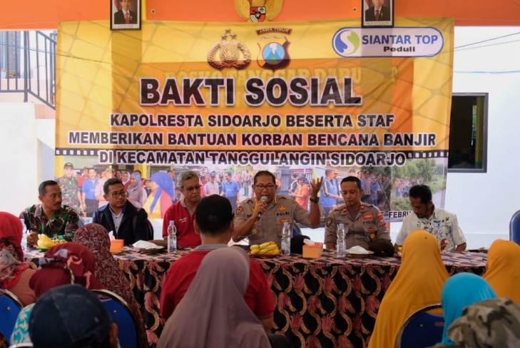 Sidoarjo, NEODEMOKRASI.COM – Kapolresta Sidoarjo Kombes Pol Sumardji menyerahkan bantuan 1.200 paket sembako untuk para korban banjir di Desa Kedungbanteng dan Desa Banjarasri, Kecamatan Tanggulangin, Sidoarjo, Kamis (27/2). Penyerahan bantuan itu diserahkan secara simbolis kepada para penerima di Balai Desa Kedungbanteng, Kecamatan Tanggulangin, Sidoarjo.
