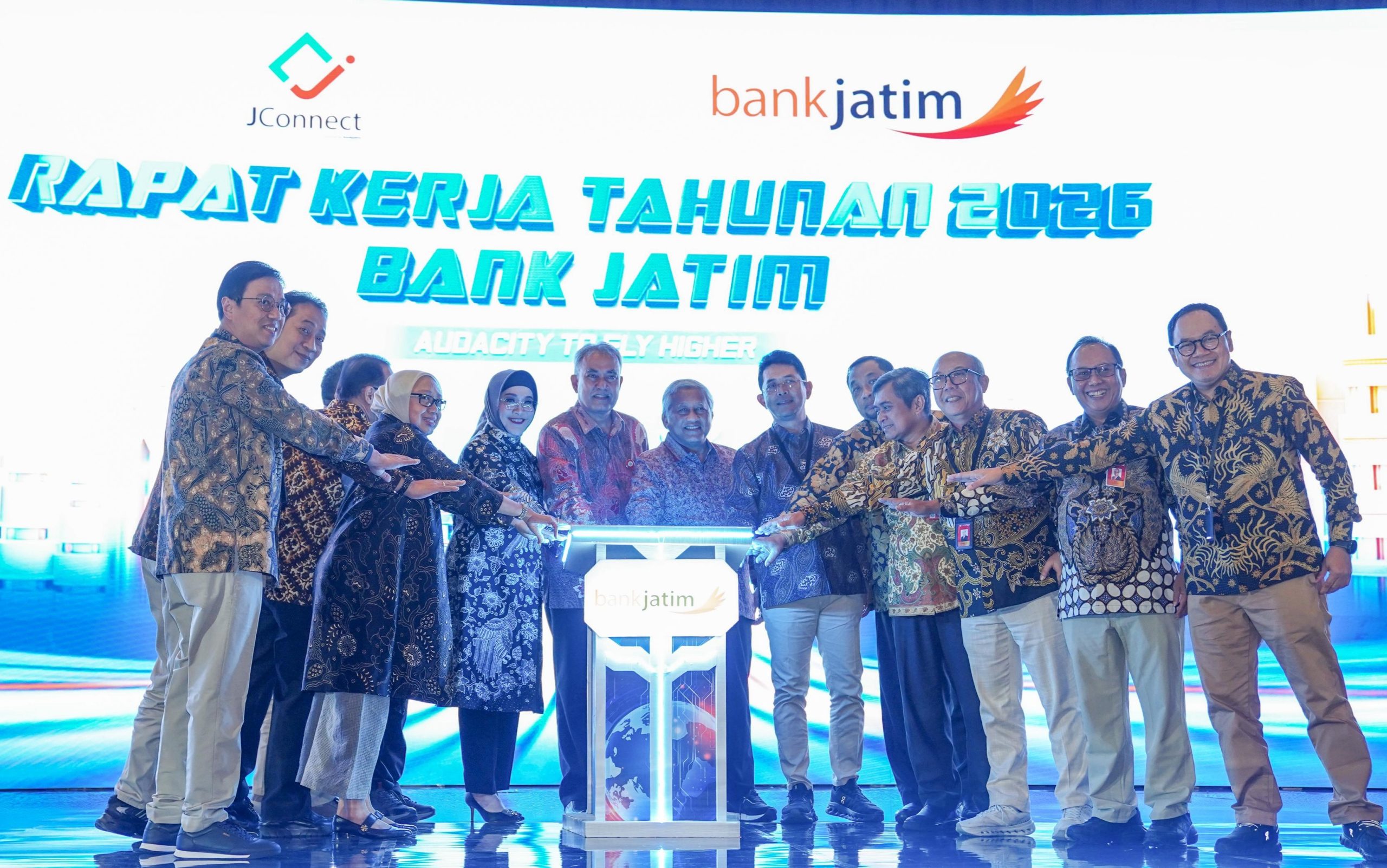 Malang. NEO DEMOKRASI. COM. PT Bank Pembangunan Daerah Jawa Timur Tbk (Bank Jatim) telah menyelenggarakan Rapat Kerja Tahunan (Rakerta) Tahun 2026 pada hari Jumat-Sabtu (6-7 Februari 2026). Rakerta merupakan forum strategis untuk mengevaluasi kinerja tahun sebelumnya dan sekaligus merumuskan arah kebijakan serta strategi bisnis untuk tahun 2026. Bertempat di Ballroom Hotel Grand Mercure Mirama Malang, kegiatan tersebut dihadiri oleh Gubernur Jawa Timur Khofifah Indar Parawansa, Menteri Pendidikan dan Kebudayaan Republik Indonesia Periode 2009-2014 Prof. Dr. Ir. Mohammad Nuh, DEA, jajaran Dewan Komisaris, jajaran Dewan Pengawas Syariah, jajaran Direksi, SEVP, VP, serta seluruh pemimpin cabang dan pemimpin cabang pembantu Bank Jatim.