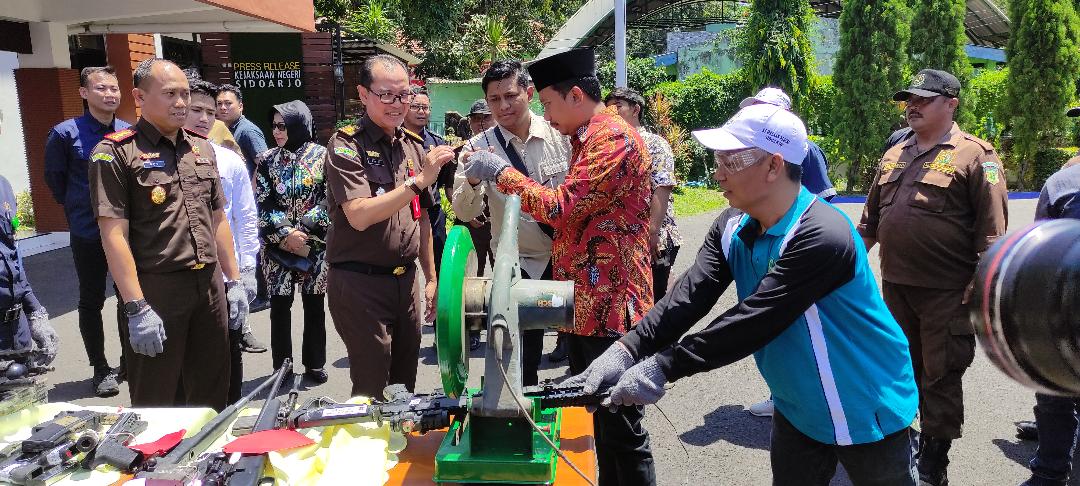 Bupati Sidoarjo Ahmad Muhdlor ikut memusnahkan senpi rakitan di kantor Kejari Sidoarjo.