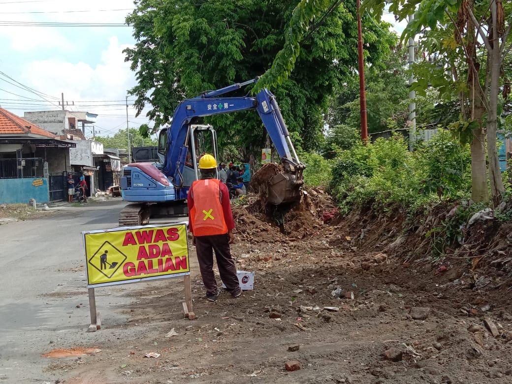Alat berat melakukan penggalian tanah di Jalan Sawocangkring Wonoayu.