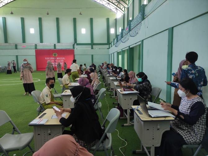 Pelaksanaan vaksinasi di ponpes dimulai pukul 08.00 WIB. Dilakukan di gedung olahraga Ponpes Progresif Bumi Salawat, Desa Lebo, Kecamatan Sidoarjo Kota.