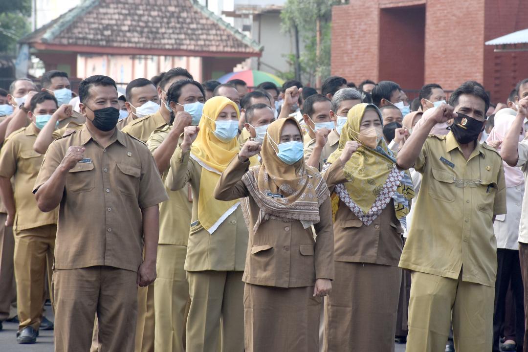 “Mulai hari ini kita melaksanakan apel pagi, sesuai Peraturan Pemerintah tentang Disiplin Pegawai yang salah satunya terkait apel pagi,” jelas Sekdakab Teguh Gunarko.