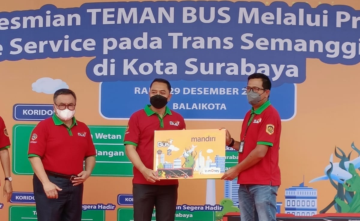 Kerja sama Bank Mandiri dengan Pemkot Surabaya untuk pembayaran tap on bus pada layanan Teman Bus di Kota Surabaya.