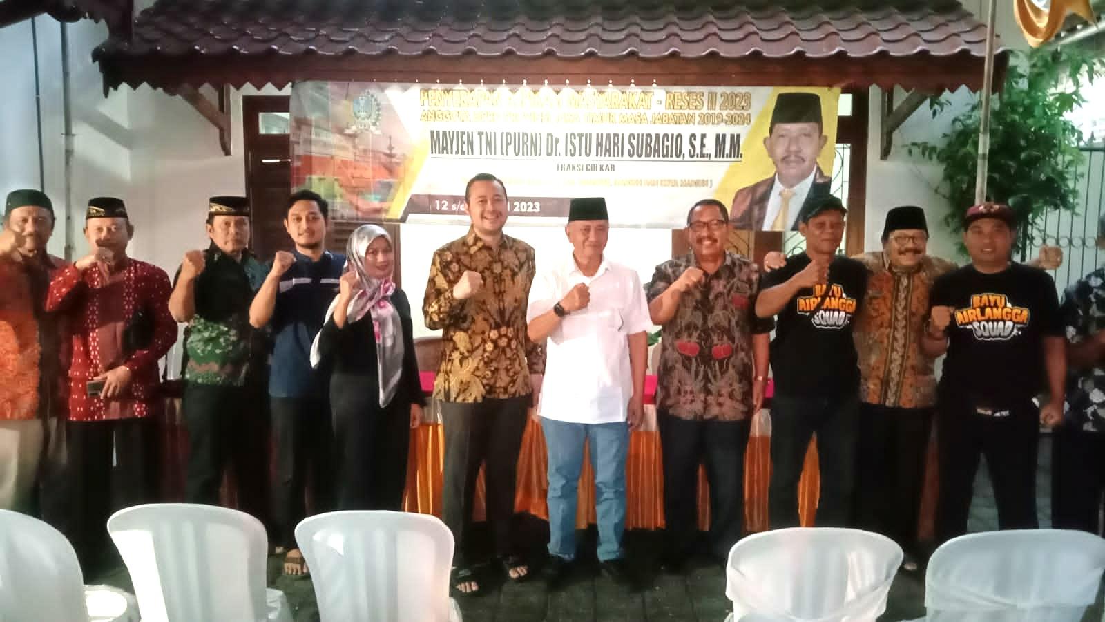 Nganjuk.NEODEMOKRASI.COM. Reses hari kedua Ketua Komisi A DPRD Provinsi Jatim, Mayjen TNI (Purn) Dr. Istu Hari Subagio, S.E, M.M   digelar di  Balai Desa Nglawak  kecamatan Kertosono  Kabupaten Nganjuk, Kamis 14/7/2023. Dihadiri sekkitar 125 orang yang terdiri dari petani, tokoh masyarakat,  pelaku UKM/UMKM  dan masyarakat umum.   Pada kesempatan itu, politisi senior Golkar ini   tak henti hentinya   menyemangati dan  mendorong upaya pemulihan ekonomi masyarakat Jawa Timur guna mendukung  terwujutnya target  Indonesia Emas 2045.   Pentingnya kemajuan dan percepatan pembangunan desa dan pemberdayaan masyarakat desa terus ia gaungkan di setiap kegiatan reses ke 2 tahun 2023  yang digelar di beberapa desa di wiilayah kabupaten Nganjuk. Dan kota serta kabupaten Madiun, yang merupakan  wilayah dapil Jatim XI.