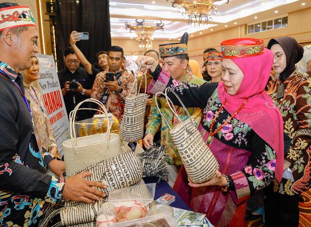 Gubernur Jawa Timur Khofifah Indar Parawansa melihat salah satu produk dalam misi dagang dan investasi ke Kalimantan Tengah.