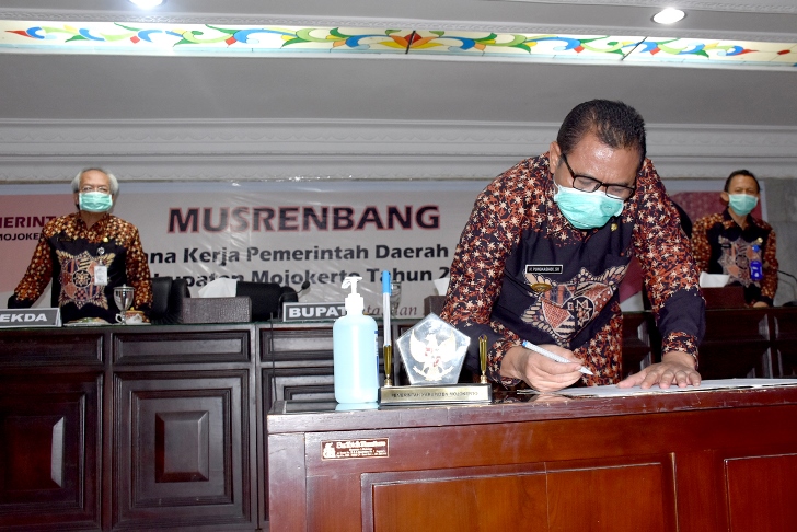 Hal ini disimak bersama dalam sambungan video converence (vidcon) acara Musyawarah Perencanaan Pembangunan (Musrenbang) Rencana Kerja Pemerintah Daerah (RKPD) Kabupaten Mojokerto tahun 2021, Selasa (7/4) di ruang Satya Bina Karya.