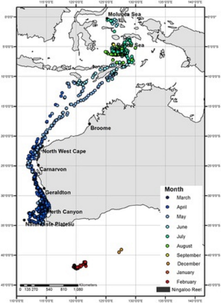 Peta pergerakan migrasi paus tiap bulannya.