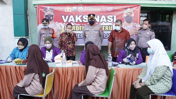 Dengan menyediakan 600 dosis vaksin Covid-19 bagi para pelajar, Kapolresta Sidoarjo Kombes Pol. Kusumo Wahyu Bintoro turun langsung memantau jalannya vaksinasi.