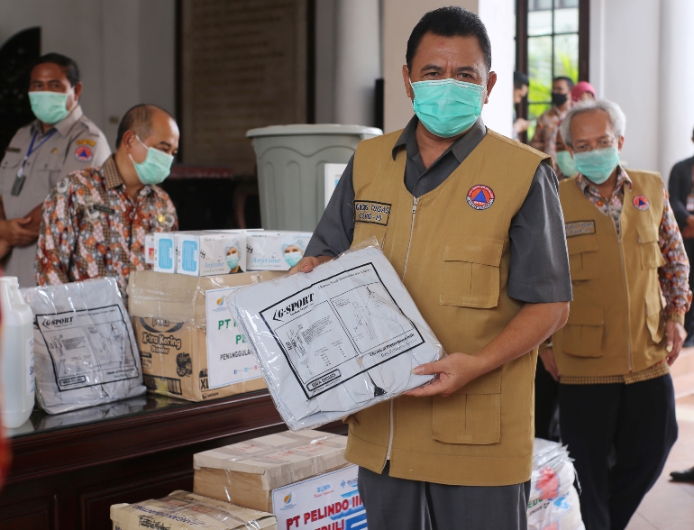 Bantuan diserahkan Soegeng Prayitno selaku perwakilan Pelindo III berupa 22 unit wastafel portable, 100 boks masker medis, 100 boks sarung tangan medis, 100 buah APD, serta disinfektan, hand sanitizer dan sabun cuci tangan cair masing-masing sebanyak 50 jerigen.