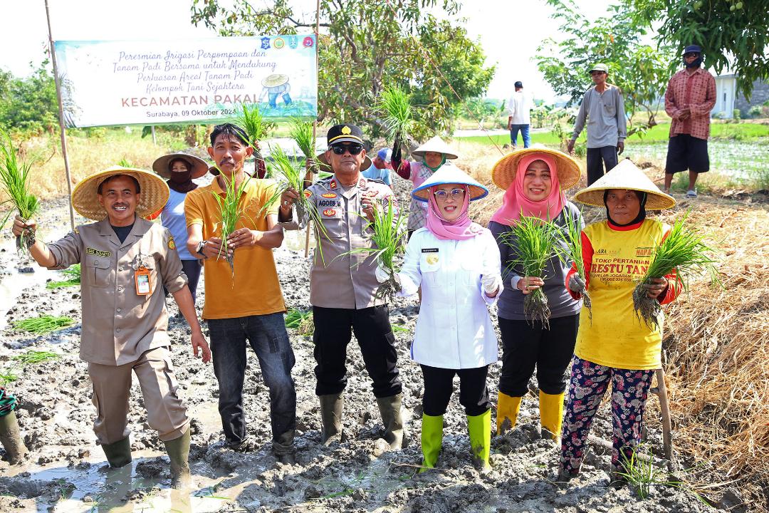 Surabaya, NEODEMOKRASI.COM – Pemerintah Kota (Pemkot) Surabaya bersama Kepala Pusat Standarisasi Instrumen Peternakan dan Kesehatan Hewan, Kementerian Pertanian (Kementan) Agus Susanto meresmikan irigasi perpompaan dan melakukan tanam padi untuk mendukung perluasan areal tanam, di Kecamatan Pakal, Rabu (9/10).