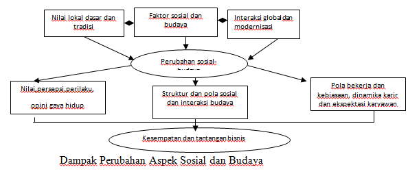 Pengaruh budaya mulai dilibatkan dalam perkembangannya dan apa saja pengaruhnya terhadap gaya hidup masyarakat saat ini. Salah satu hal yang penting dalam bidang ekonomi dan mampu memberikan pengaruhnya dalam bisnis adalah kinerja perusahaan dalam social-culture environment. Indonesia memang bukan merupakan Negara yang maju melainkan sebuah Negara yang memiliki kemauan untuk berkembang dengan segala kekayaan hayati yang dimiliki. Budaya adalah sistem pengetahuan dan ide-ide (pengetahuan budaya), yang secara sadar atau tidak menjadi milik unit masyarakat dan diperoleh dengan cara akumulatif, yang berfungsi sebagai direktif dan bimbingan sikap dan perilaku masyarakat yang menyandang sistem ini (Goodenough,1971, Spradley, 1972 and Geertz,1973). Kemudian ilmuwan Kluckhohn dan Strodbeck (1961) dalam Suryo (2014) menyatakan terdapat lima kategori orientasi nilai-nilai budaya dari masyarakat, yaitu :