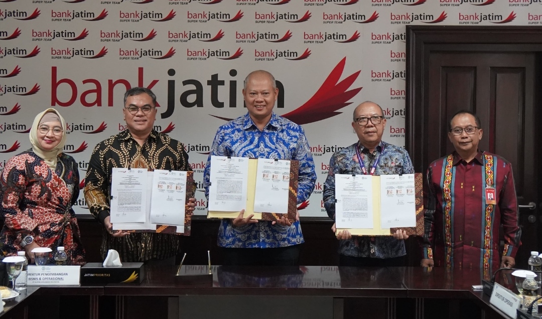 Surabaya. NEODEMOKRASI. COM. PT Bank Pembangunan Daerah Jawa Timur Tbk (Bank Jatim) telah melakukan penandatanganan Nota Kesepahaman atau Memorandum of Understanding (MoU) dengan PT Kliring Berjangka Indonesia (Persero) (PT KBI) dan PT Kliring Perdagangan Berjangka Indonesia (PT KPBI) pada hari Selasa (6/8). MoU yang ditandatangani yaitu tentang Kerja Sama Layanan Jasa Perbankan dan Pemanfaatan serta Pengembangan Sistem Resi Gudang.