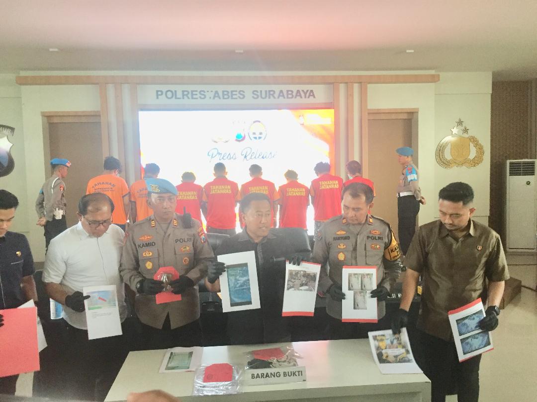 Kasatreskrim Polrestabes Surabaya AKBP Aris Purwanto dan anggotanya menunjukkan barang bukti dan 8 tersangka hasil tangkapan selama seminggu.