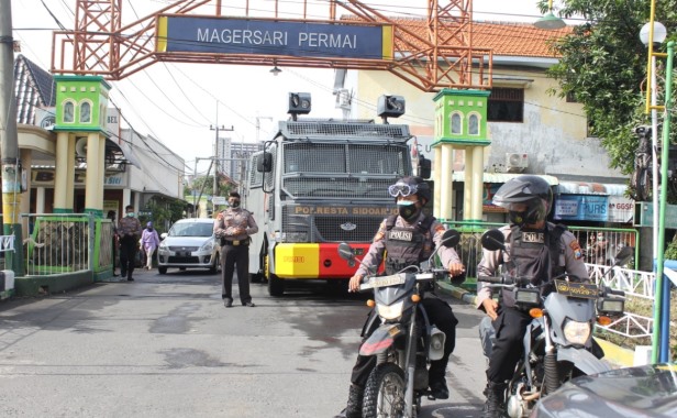 Seperti dilakukan Polresta Sidoarjo pada Rabu (3/2). Menggunakan mobil AWC dan mobil penerangan dalmas melakukan penyemprotan disinfektan, sosialisasi PPKM, dan disiplin protokol kesehatan.