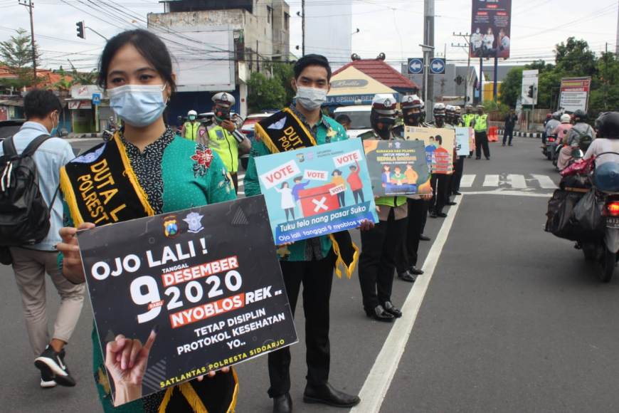 Sidoarjo, NEODEMOKRASI.COM – Berbagai pesan ajakan untuk memilih calon bupati dan wakil bupati dalam Pilkada 2020 Sidoarjo pada 9 Desember 2020, disampaikan sejumlah Polwan Satlantas Polresta Sidoarjo. Mereka memberikan imbauan kepada para pengendara yang melintas di Alun-alun Sidoarjo dan Babalayar Sidoarjo, Senin (7/12).