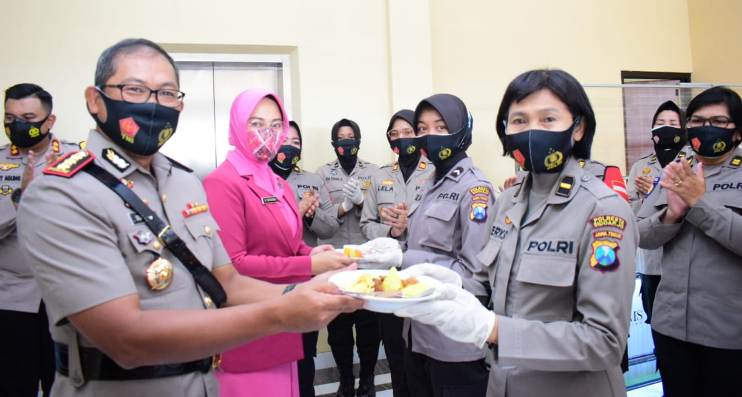 Kapolresta Sidoarjo Kombes Pol Sumardji memberikan tumpeng kepada salah satu polwan.