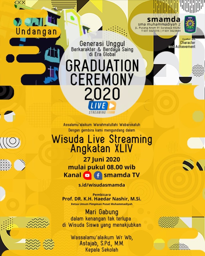 Surabaya, NEODEMOKRASI.COM – SMA Muhammadiyah 2 Surabaya (Smamda) menggelar acara wisuda angkatan XLIV di sekolah, Sabtu (27/6). Wabah pandemi Covid 19 yang menghitamkan area Surabaya yang hingga kini belum berakhir mengharuskan Smamda utk melaksanakan wisuda virtual.