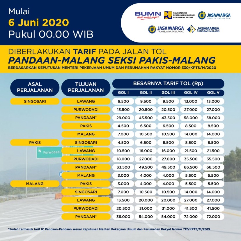 Surabaya, NEODEMOKRASI.COM – Terhitung mulai Sabtu (6/6) pukul 00.00 WIB, tarif untuk Jalan Tol Pandaan Malang Seksi V (Pakis-Malang) sepanjang 3,113 km resmi diberlakukan. Ruas tersebut telah diuji coba pengoperasian tanpa tarif tol sejak 7 April 2020.