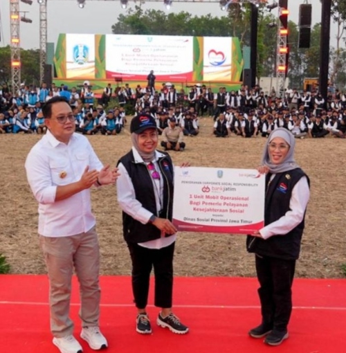 Pasuruan. NEODEMOKRASI. COM.  Sebagai bentuk tanggung jawab sosial perusahaan kepada lingkungan sekitar, PT Bank Pembangunan Daerah Jawa Timur Tbk (Bank Jatim) kembali menyerahkan bantuan Corporate Social Responsibility (CSR). Kali ini, bantuan CSR diberikan kepada Dinas Sosial Provinsi Jawa Timur berupa 1 (satu) unit mobil operasional bagi Pemerlu Pelayanan Kesejahteraan Sosial (PPKS). Bertempat di Sampoerna Entrepreneurship Training Center (SETC) Pasuruan, bantuan diserahkan oleh Direktur Kepatuhan Bank Jatim Umi Rodiyah kepada Kepala Dinas Sosial Provinsi Jawa Timur Restu Novi Widiani pada hari Jumat (13/9). Turut hadir menyaksikan penyerahan CSR tersebut Pj. Gubernur Jawa Timur Adhy Karyono.