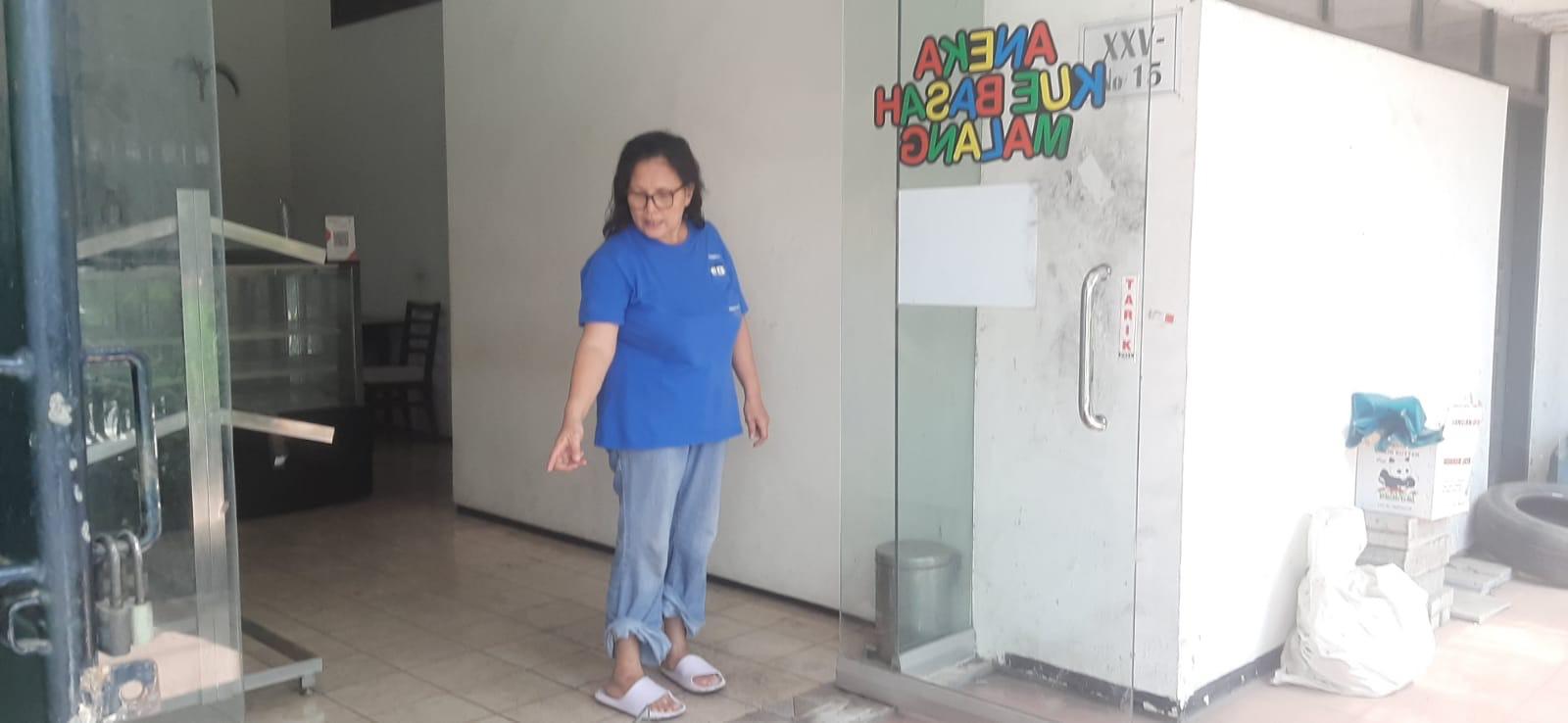 Korban pemilik toko kue menunjukkan lokasi barang berharga yang raib.