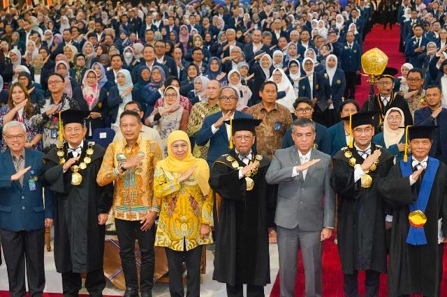 Gubernur Khofifah menyampaikan apresiasi kepada Universitas Brawijaya yang telah melakukan peran strategis sebagai perguruan tinggi dalam membangun sumber daya manusia unggul dan menghadirkan solusi konkret untuk menjawab tantangan zaman. Alhamdulillah Jawa Timur saat ini memiliki 344 perguruan tinggi, dengan 17 perguruan tinggi negeri dan 327 perguruan tinggi swasta.
